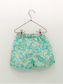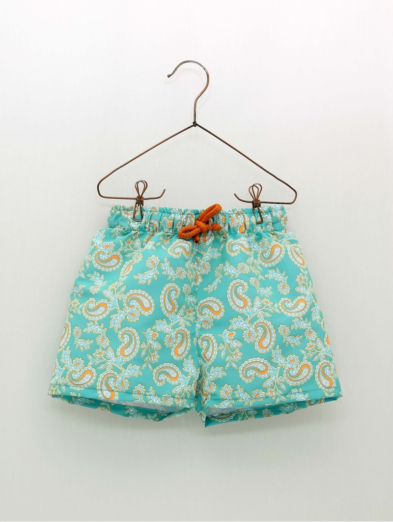 Boys’ swimming costume in aqua green water colour with cashmere print, orange contrasting drawstring detail. Cashmere Collection. Made in Spain