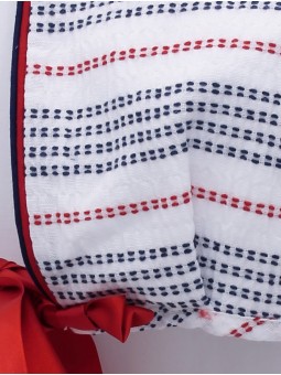 Striped cheesecloth bonnet with stitch effect with double piping and satin bow. Ideal for the romper 2215070. Nautic Collection. The best navy look. Desgined and manufactured in Spain