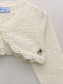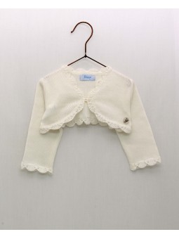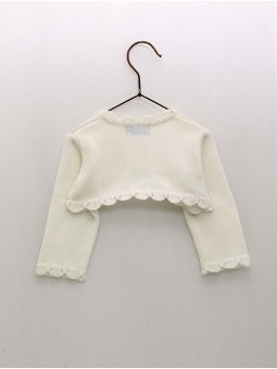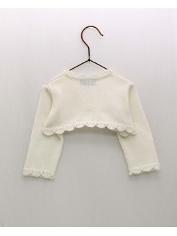 Short plain knitted jacket for baby girls aged 0 to 36 months, made of cotton, bolero-style, front button and wave finishes. Available in various colours. Pair it with dresses and babygrows from our collections. Designed and made in Spain.