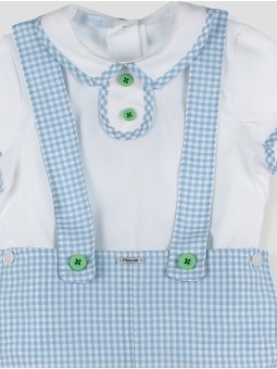 A classic set with a charming touch. This boys' outfit features a short-sleeved white shirt with a Peter Pan collar and blue gingham details, paired with matching suspender shorts. The contrasting buttons add a unique touch, while the adjustable suspenders ensure a perfect fit. Ideal for special occasions and celebrations, this set combines freshness and elegance for little ones. Made in Spain
