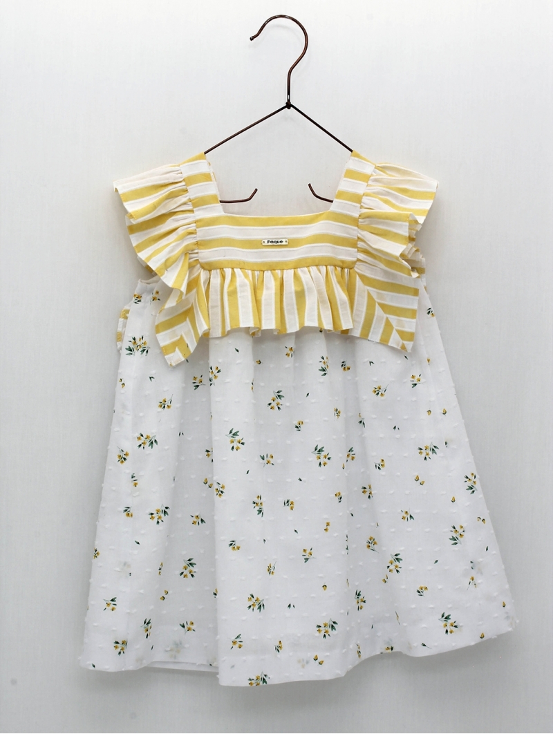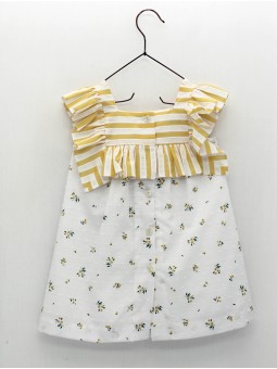 Baby girl dress in plumeti flower print with cap and wide striped ruffle. It has a corporate plate on the front. Fastens at the back with matching buttons. Yellow Flower collection. Designed and manufactured in Spain