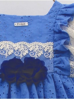 Romper in embroidered cambric with micro-ruffles on the armholes and embroidered tulle pieces. Removable tulle flower ornament to match. 2 colours available. A very flattering and colorful look for special occasions. Designed and manufactured in Spain.