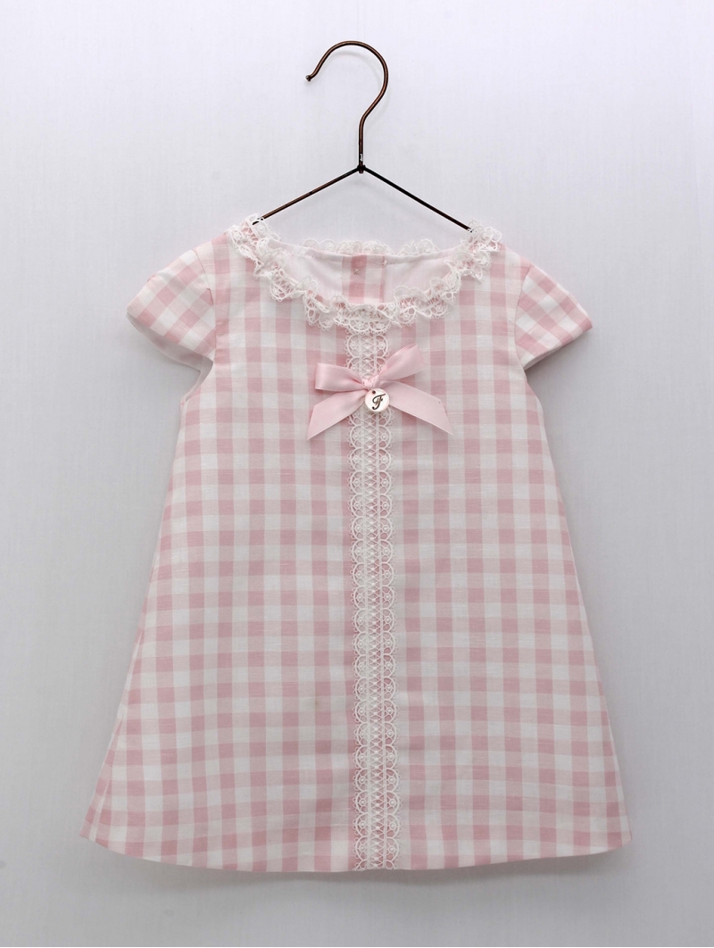 Girl's dress made of a blend of linen and cotton in a vichy check, collar and front edging with satin bow detail, half sleeves with an evase cut. Size from 0 to 36 months. Sweet Collection. Complete the look with the jacket reference 2311810