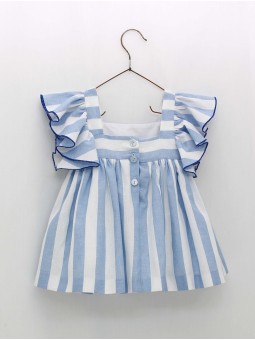 Girl's dress made of blue and white striped fabric, square neck and ruffled sleeves topped with blue ruffles. Jib corporate sheet on the front. Size from 0 months to 6 years. Port Collection