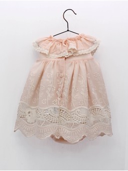 Little girls’ bloomer dress made of 100% cotton chiffon with embroidered fretwork, sleeveless, collar with peak-shaped ruffle and matching bloomers. Available in pink, green and ecru. Complete the look with jacket reference 2411810. Made in Spain