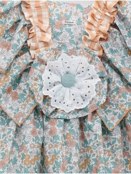 Girls’ dress made of cotton and linen blend fabric with a beautiful flower print, ruffles on the sleeves with matching piping, apricot chequered ruches finished with flower rosette with white embroidered trim detail and aqua green button. The dress has a lining finished with delicate lace. Nana Collection. Made in Spain