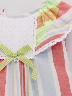 Girls’ dress made of exclusive Foque vertical striped fabric. Ruffle-shaped yoke finished with a embroidered strip with white bobbles and fluorescent details, it has a central piece in cotton openwork fabric with a gingham bow. The design features a V-neckline at the back and a small ruffle at the bottom. Invisible zip fastening. Sizes from 0 months to 8 years. Lorenzo Collection. Made in Spain