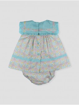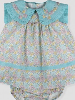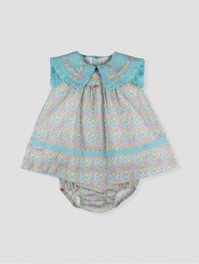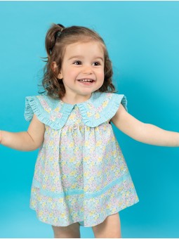 Charming floral-print dress in pastel tones, featuring a delicate ruffled turquoise blue collar and soft pleated details Crafted from lightweight fabric for ultimate comfort and freshness Includes a matching bloomer for a complete look Perfect for summer days, celebrations, or special moments, ensuring your little one looks adorable while feeling comfortable Part of the *Saint Tropez* collection Available in sizes from 0 to 36 months Made in Spain