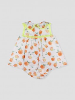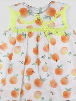 Baby girl dress made from 100% cotton fabric with an exclusive peach print in orange tones, featuring a scalloped collar with fluorescent lace and a sleeveless design. It fastens at the back and includes an inner lining with lace detailing. Available in sizes from 0 to 48 months. La Habana Collection.Designed in Spain