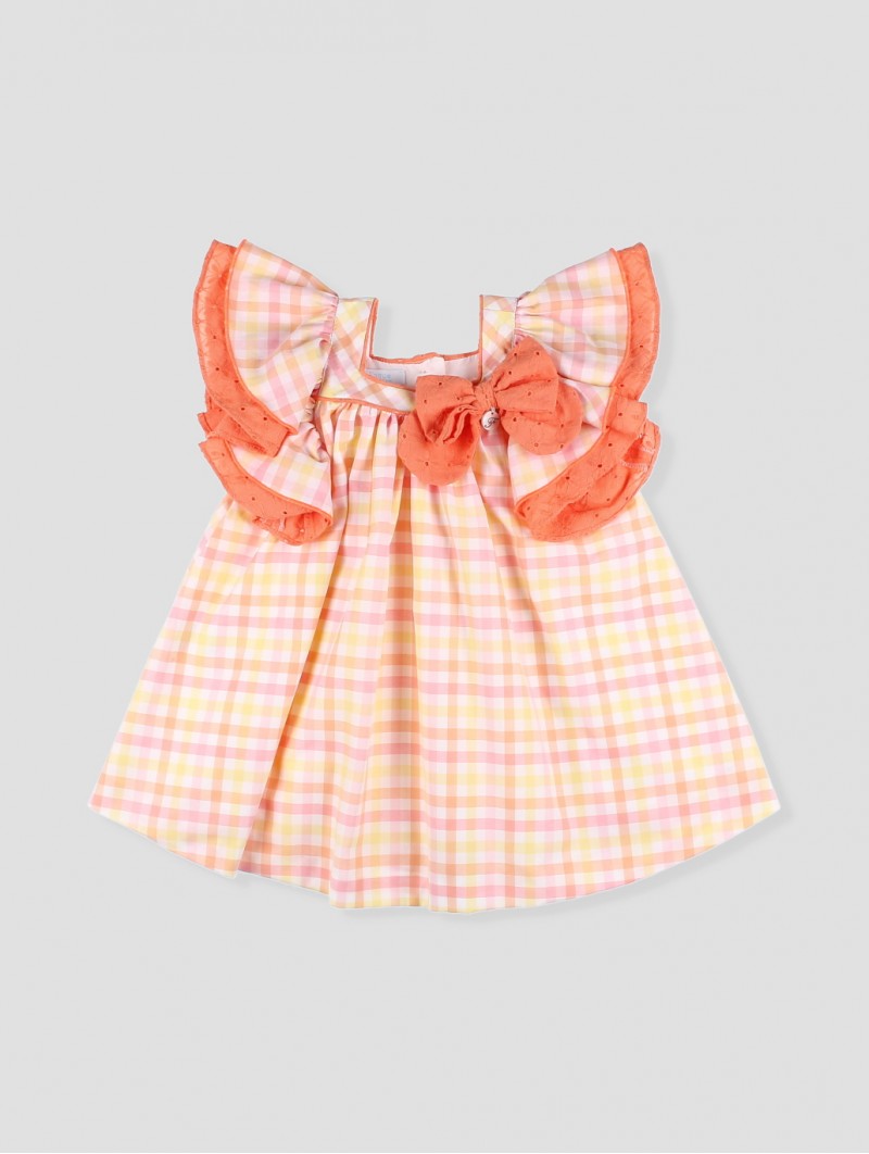This pastel gingham dress beautifully blends delicacy and style. Embroidered English lace ruffles in coral adorn the shoulders, adding charm and volume to the design. A decorative central bow enhances its appeal, while the soft, lightweight fabric ensures comfort with every movement. Perfect for summer outings and special celebrations due to its fresh and joyful design. A garment that exudes sweetness and elegance! Made in Spain.
