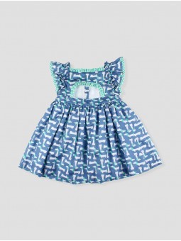 Girl's dress with a cheerful dachshund print and ruffled shoulder details. Featuring a charming design with a back opening, vichy check trim, and decorative front pockets. Made from soft and lightweight fabric, it is perfect for sunny days and special occasions. A look that blends fun and elegance, ensuring your little one always shines. Made in Spain.