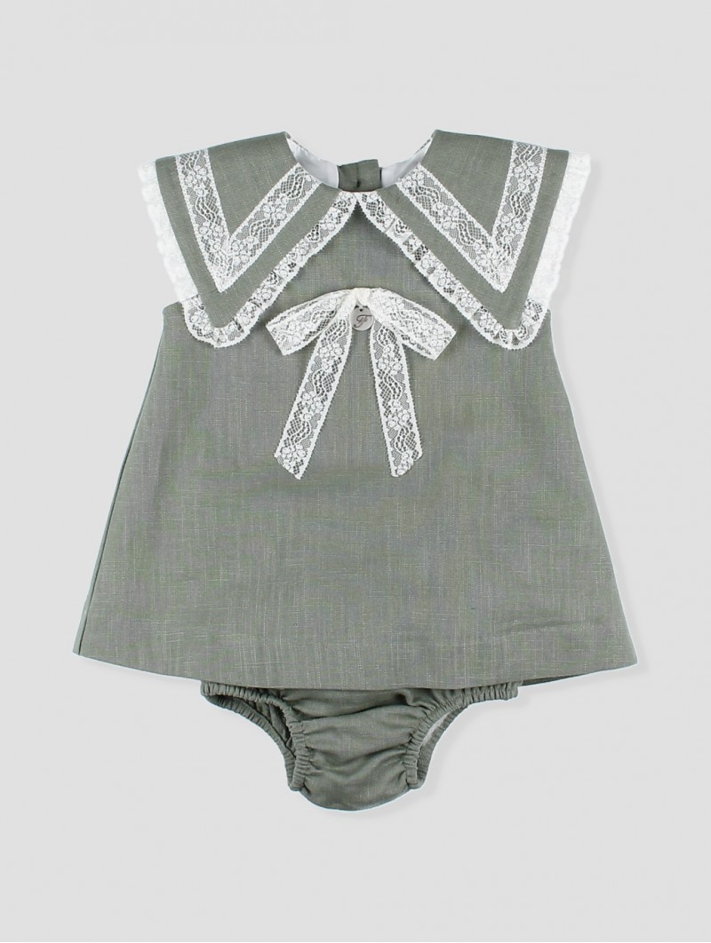 This adorable girls' outfit in green features a dress with a maxi collar and matching bloomer. The wide collar, adorned with white lace, creates an elegant contrast. A central lace bow enhances the front design, while back buttons facilitate easy dressing. Crafted from lightweight linen fabric, it is perfect for special occasions. Pair it with the matching bonnet from the same collection. Made in Spain