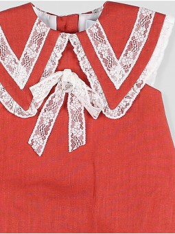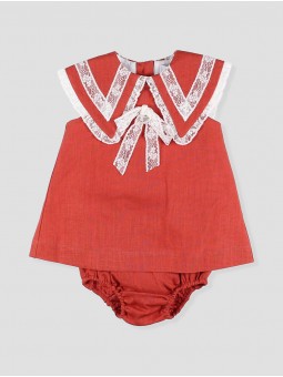 This adorable girls' outfit in green features a dress with a maxi collar and matching bloomer. The wide collar, adorned with white lace, creates an elegant contrast. A central lace bow enhances the front design, while back buttons facilitate easy dressing. Crafted from lightweight linen fabric, it is perfect for special occasions. Pair it with the matching bonnet from the same collection. Made in Spain