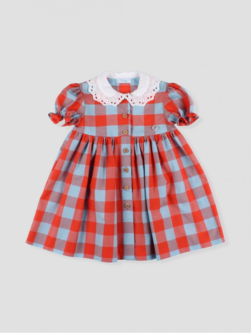 Girl’s dress in large-format vichy fabric with charming red and blue checks. Featuring a delicate Peter Pan collar with lace embroidery for an elegant touch. The puffed sleeves add volume and sophistication, while the front wooden-tone buttons make dressing easy. Perfect for special occasions or sunny days, blending freshness and timeless style. Made in Spain.