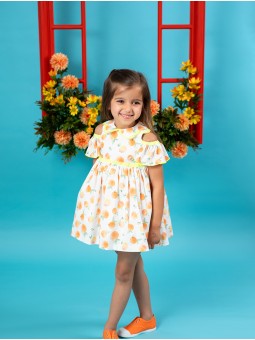 Girl’s dress with a peach print, crafted from lightweight and breathable fabric. Elegant shoulder ruffles with neon trim add a touch of freshness and style, perfect for sunny days. Its loose fit ensures comfort and freedom of movement, ideal for strolls, celebrations, and summer days. Features a back closure for easy dressing. A garment that blends modern design with a playful, childlike charm. Made in Spain.