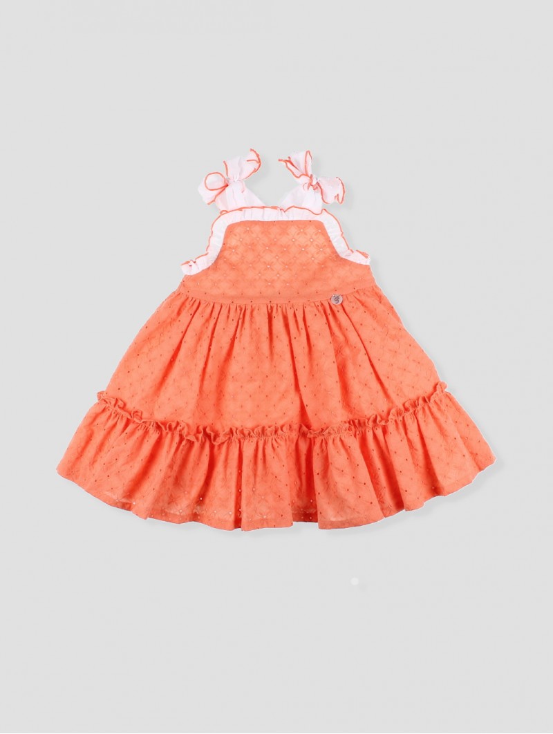 Strappy dress made from embroidered coral fabric. A fresh and charming design featuring ruffle details and cross-back straps that tie into a bow, crafted in plumeti fabric with tonal trims for added elegance. The flared skirt and delicate embroidery add a touch of sweetness, making it the perfect choice for celebrations or outdoor strolls. A unique piece that blends design and functionality. Made in Spain
