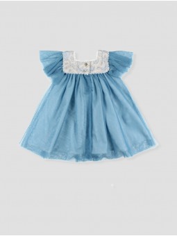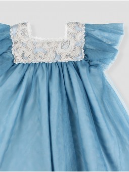 This adorable girl’s tulle dress combines elegance and charm. Available in soft blue and dusty pink, it features a delicately embroidered lace yoke for a refined touch. Airy flutter sleeves add grace and comfort, allowing freedom of movement. Ideal for celebrations or formal events, this essential piece ensures your little one shines on any special occasion. Made in Spain