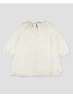 Girl’s dress crafted in ivory lace with matching inner lining, perfect for those moments that call for a special outfit. It features a charming gathered neckline with lace trim, a grosgrain bow on the chest, and long sleeves with elasticated cuffs. Its soft A-line shape and delicate lace bring a romantic flair that both mothers and daughters will love. Part of our El Teatro collection, designed to shine on special occasions. Made in Spain