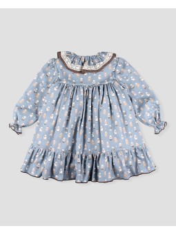 This charming girl's dress features an adorable teddy bear print on a dusty blue base. The flared silhouette with a wide ruffled hem adds movement and sweetness. It’s finished with a gathered round neckline, delicate lace trim, and a contrast chocolate bow for a refined look. Long sleeves with elastic cuffs and front buttons complete the design. A romantic and versatile model that's a hit this season. La Cabaña Collection. Made in Spain