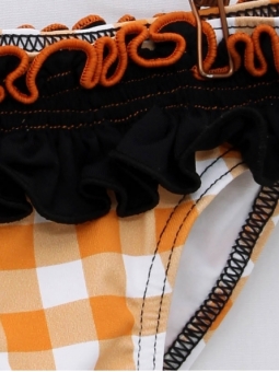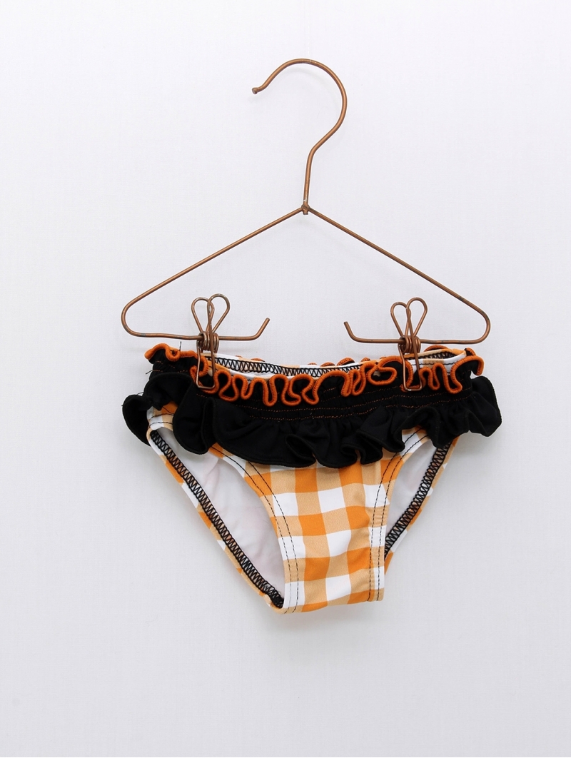 Baby girl swim briefs with gingham checks and contrast ruffle. Orange embroidered rubber bands. Complete your look with the romantic style print T-shirt 2215066. We love checks!