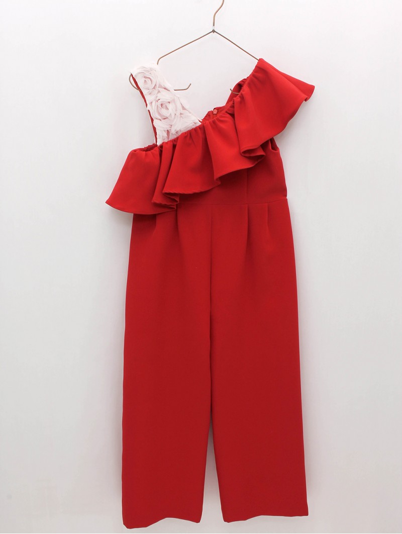 Girls’ long red jumpsuit with ruffle neckline and floral strap. Caterina Collection. Made in Spain