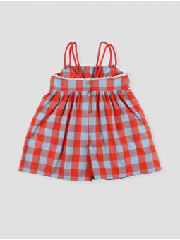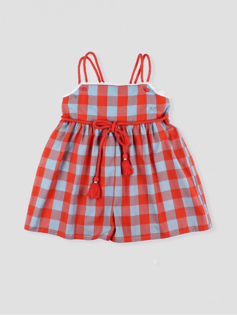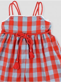 This charming girl’s short romper, featuring a cheerful coral and sky-blue checkered pattern, is perfect for summer adventures. The square neckline with delicate lace trim adds sweetness, while the rope straps and adjustable tassel belt create a playful nautical style. Its relaxed fit ensures comfort and freshness, making it an ideal choice for playtime, beach outings, or summer vacations. A vibrant, breezy essential for warm days. Made in Spain