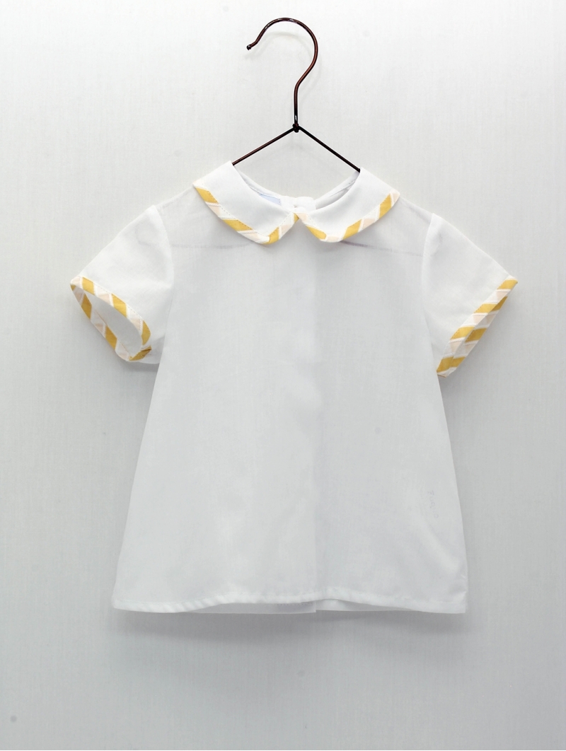 White baby shirt with shirt collar and contrast piping in striped fabric. Yellow Flower Collection. This shirt is so versatile that it has many combinations. We suggest you combine it with our georgeous striped overalls in the same 221 fabric.