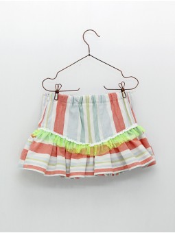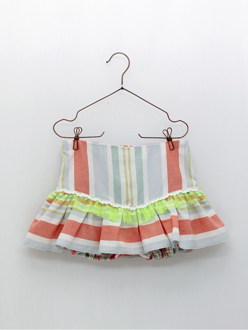 Girls’ shorts made of exclusive Foque fabric with multicoloured stripes with ruffle simulating a skirt and fluorescent details. Pair it with the openwork knitted top combined with plumetis from the Lorenzo Collection. Made in Spain