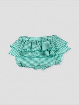 These baby bloomers in soft green gingham fabric are perfect for warm days. The delicate double ruffle detail adds a charming, elegant look, while the elastic waistband and leg openings ensure a comfortable and secure fit. Crafted from lightweight and breathable fabric, they pair beautifully with blouses and tops for fresh and stylish summer outfits. An essential piece for your baby's wardrobe. Made in Spain.