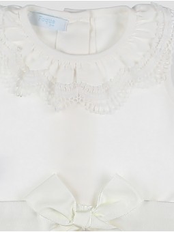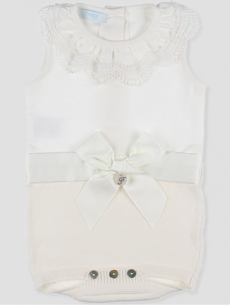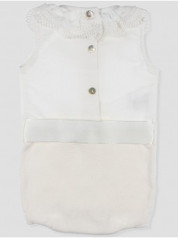 This charming baby romper combines two textures, with a soft fabric bodice and delicate knit bottom. The standout feature is the large decorative bow at the waist, adding elegance and distinction. The round neckline is adorned with fine lace for a sweet touch.Back and crotch buttons make dressing and diaper changes easy. Perfect for both special occasions and everyday wear. Made in Spain