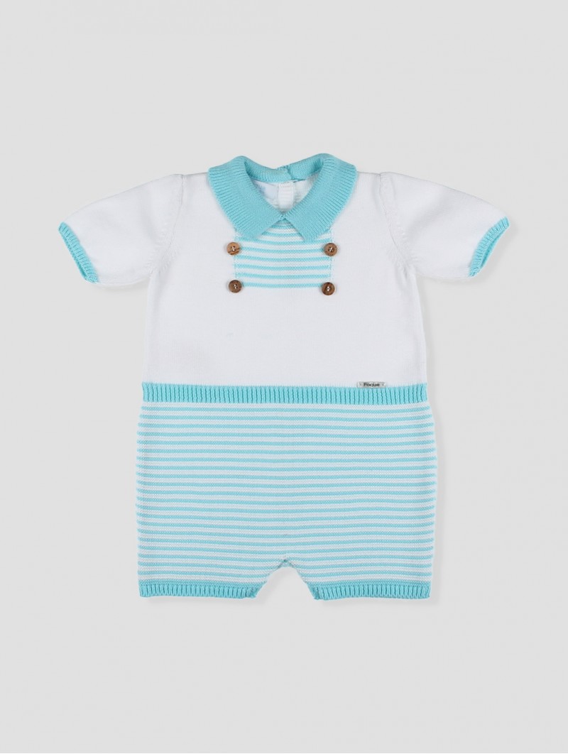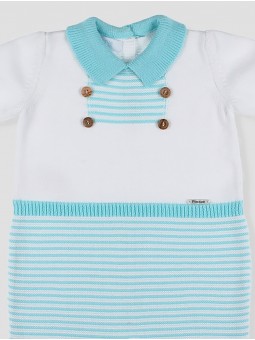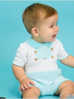 Baby knit romper made from cotton yarn in a white and turquoise combination, featuring a smooth white knit bodice with striped detail on the chest and wooden button accents, a contrasting shirt-style collar, short sleeves with turquoise cuffs, and striped bottoms with ribbed trims, part of the Saint Tropez collection, available in sizes from 0 to 36 months, with button closures on the back and legs. Designed in Spain