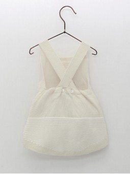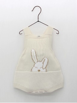 Knitted romper for baby boys/girls with straps, made of cotton, with a front drawing of a bunny, an exclusive Foque design, on a contrasting stripe. Combine it with the white plumeti blouse reference 2315026 and complete your look with the striped jacket in the reference 2311823 tone. Available in various colors. Jib exclusive design. Made in Spain.