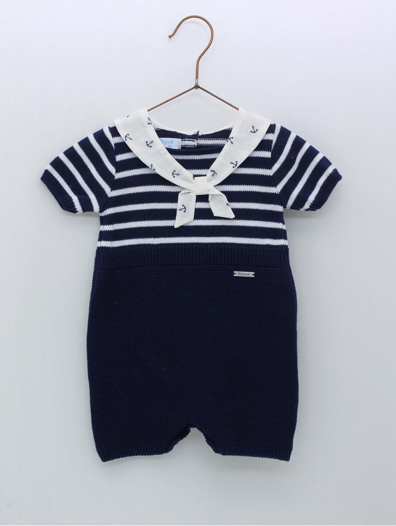 Short-sleeved navy blue romper for baby boy with white stripes and sailor collar made of fabric with anchor print. Jib corporate sheet at the waist. Anchor Collection. Jib exclusive design. Made in Spain