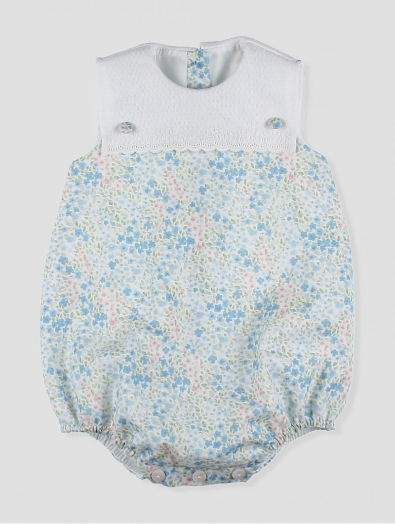 This charming baby girl romper for is a perfect choice for sunny days. The soft floral print in pastel tones adds a fresh and adorable touch. Featuring a fabric collar with delicate embroidery and decorative buttons, it combines classic elegance with comfort. Designed with a back closure and buttons at the crotch for easy changing. A lightweight and breathable outfit for all-day comfort. Made in Spain.