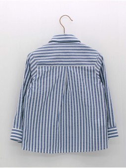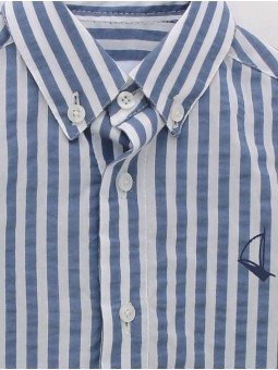 Boy's shirt with a shirt collar and long sleeves, made of 100% cotton fabric with navy blue and white stripes. Size from 2 to 14 years. Summer Collection. Made in Spain