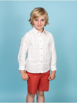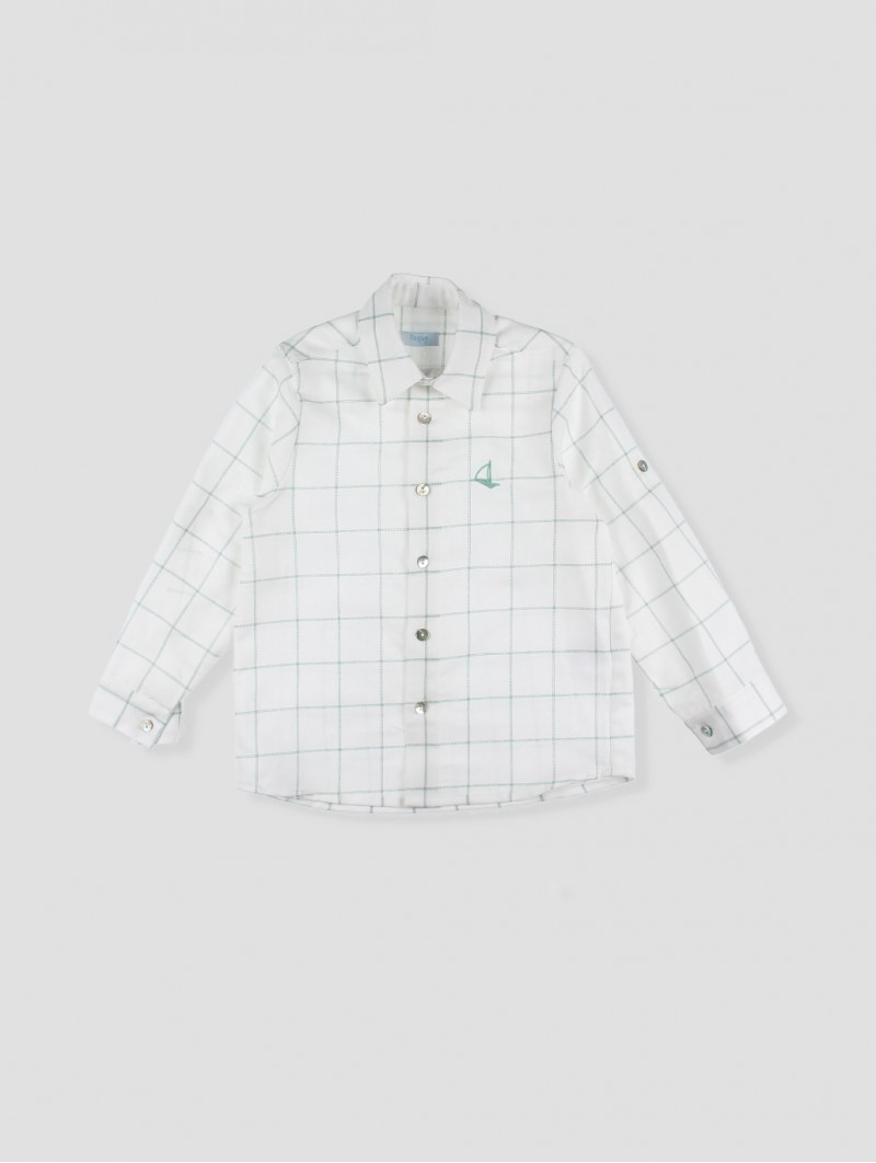 This boy’s shirt blends style and comfort in a versatile design. Featuring a classic green and white checkered pattern, it is ideal for any occasion, from special events to casual outings. The traditional cut with a shirt collar and button closure adds elegance, while the roll-up sleeves with a fastening tab provide adaptability for different weather conditions. An embroidered sailboat on the chest gives it a signature touch, reflecting FOQUE’s timeless essence. Made in Spain