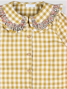 Long-sleeved girl's blouse in a cheerful mustard gingham pattern, featuring a sweet Peter Pan collar trimmed with floral ruffles for a charming contrast. The elasticated cuffs are also finished with matching ruffles, adding both style and comfort. This versatile and colorful design pairs beautifully with the suspender skirt from our El Viñedo collection. Complete the outfit with our cozy shearling vest for FOQUE total look. Made in Spain