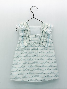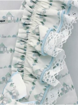 Baby girl dress with little houses pattern and ruffles on the shoulders highlighted with ruffles and white lace, bow adornment in the centre front. It fastens at the back with natural mother-of-pearl buttons. Little houses collection. We love this print!