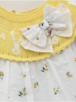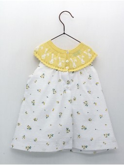 Baby girl dress in yellow flower printed plumeti with round knit cap with bunnies and bow decoration in the same printed flower and corporate badge. Yellow Flower collection. Don't you love it for Easter?