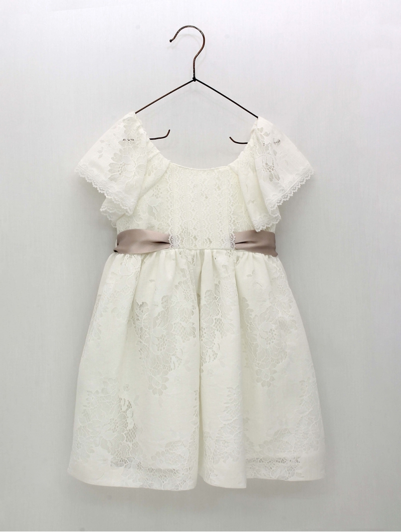 Girl's dress in ecru flower-effect lace with openwork detail, cape sleeves, and V-back with contrasting satin bow. Christening Collection. Size from 2 to 12 years. Foque exclusive design, ideal for events. Made in Spain.