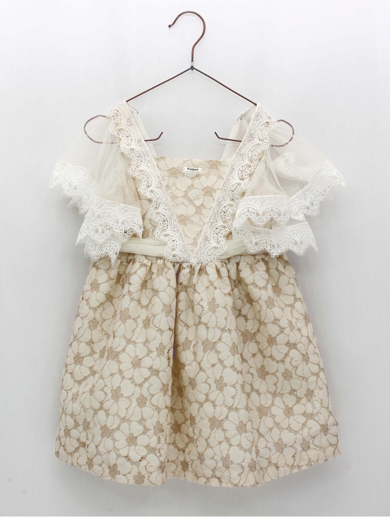 Girl's dress made of beige lace fabric, tulle sleeves with lace trim and back with a V-neckline and tulle bow. Size from 2 to 12 years. Natural Ceremony Collection. Ideal for the most special occasions. Made in Spain.