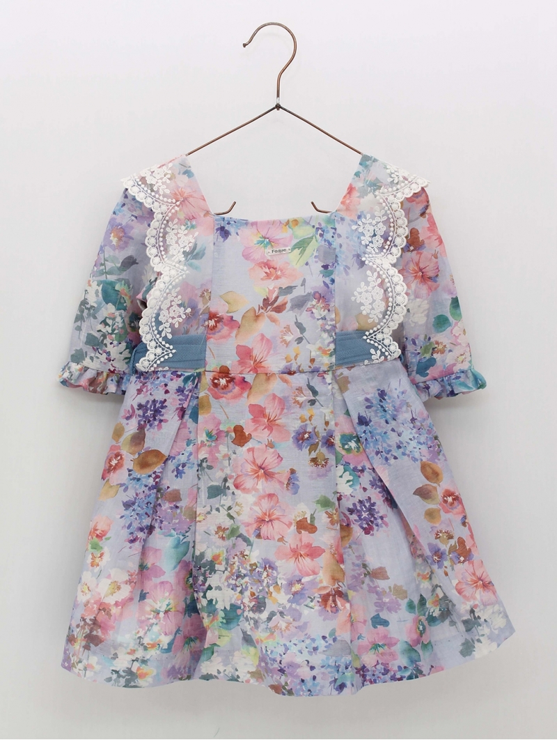 Girl's dress cut at the waist, round neckline and three-quarter sleeves, made of flower-printed fabric, white tulle lace with light blue tulle lace on the back. Size from 2 to 12 years. Ideal for events and special occasions. Watercolor Ceremony Collection. Designed and made in Spain