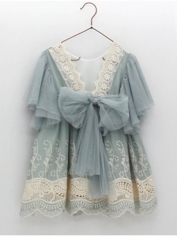 Girls’ chiffon dress with embroidered border sleeves and tulle belt with bow at the back. Betania Collection. Ideal for events, available in various colours. Made in Spain