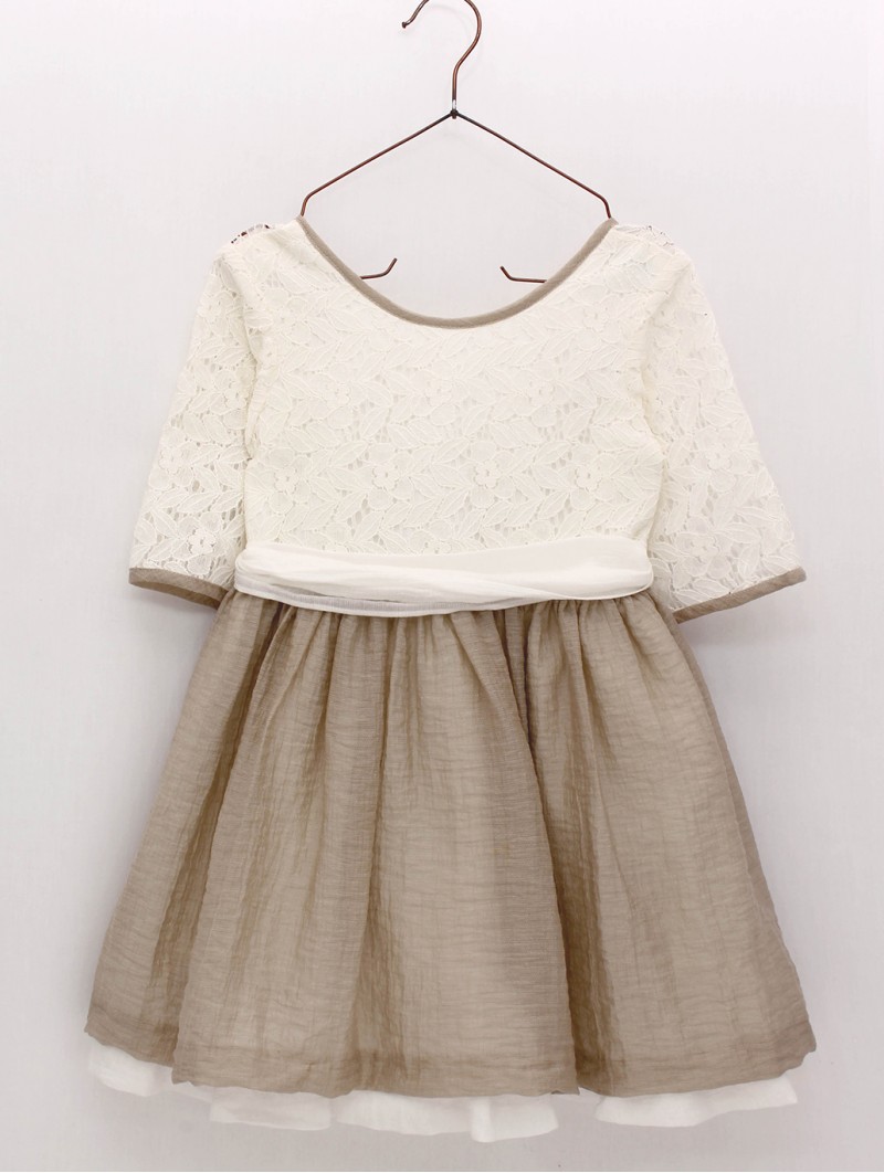Girls’ dress with French sleeves, waist cut with lace body in ecru, low-cut back highlighting the tulle lacing in contrast with the beige organdie skirt. Sizes from 2 to 12 years. Amélie Collection. Simple and elegant. Designed and made in Spain
