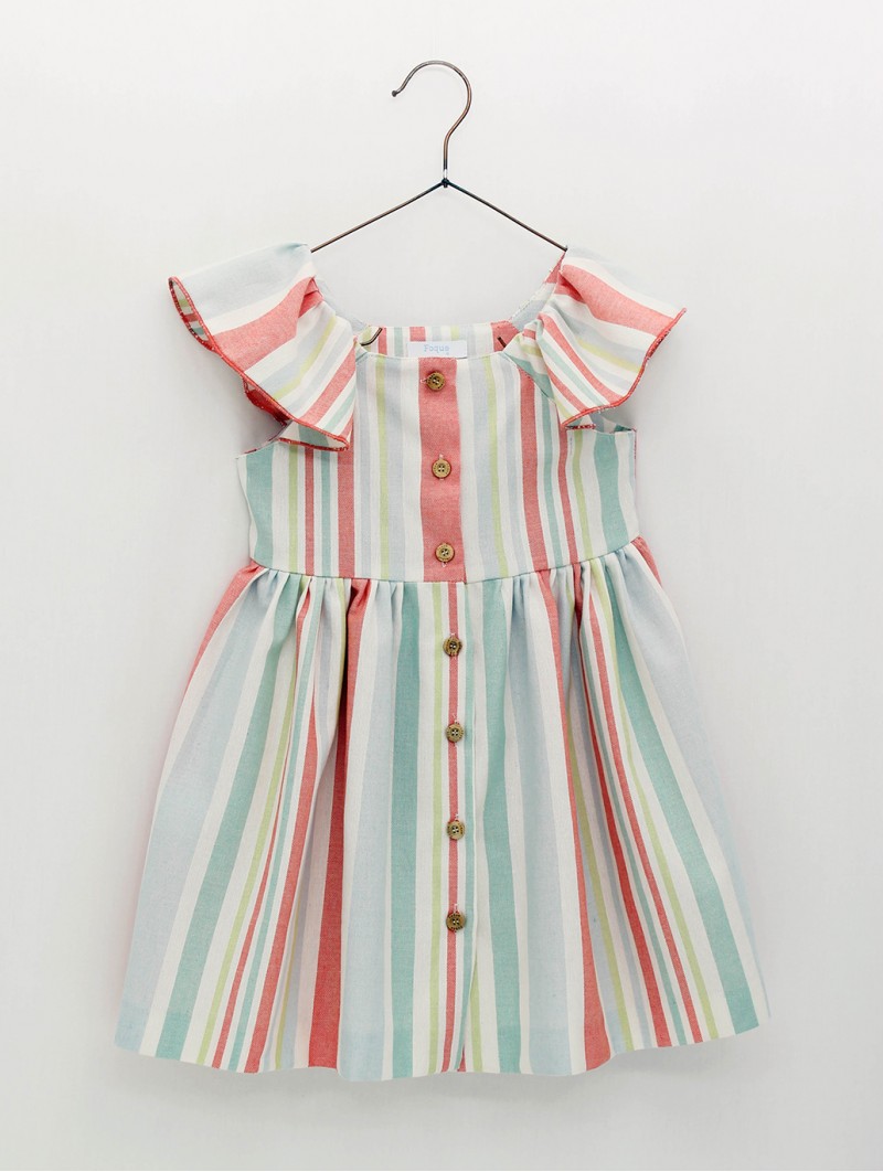 Girls’ dress made of exclusive Foque striped fabric, shirt style with wooden buttons on the front, round neckline, little ruffles on the sleeves, and waistline cut. Don’t hesitate, it fits great! Lorenzo Collection. Made in Spain