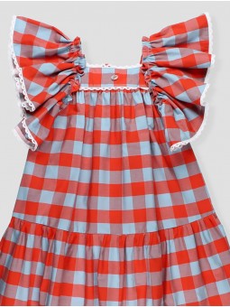 This long checkered dress for girls, both charming and breezy, is a standout choice for summer celebrations. Wide ruffles with delicate lace trim create graceful movement, while the tassel tie at the back adds a sweet finishing touch. Its flowing cut and gathered skirt ensure comfort and elegance for every occasion. Perfect to pair with the vest from the same collection, you'll achieve the look you were looking for. Made in Spain
