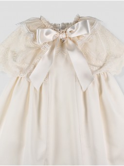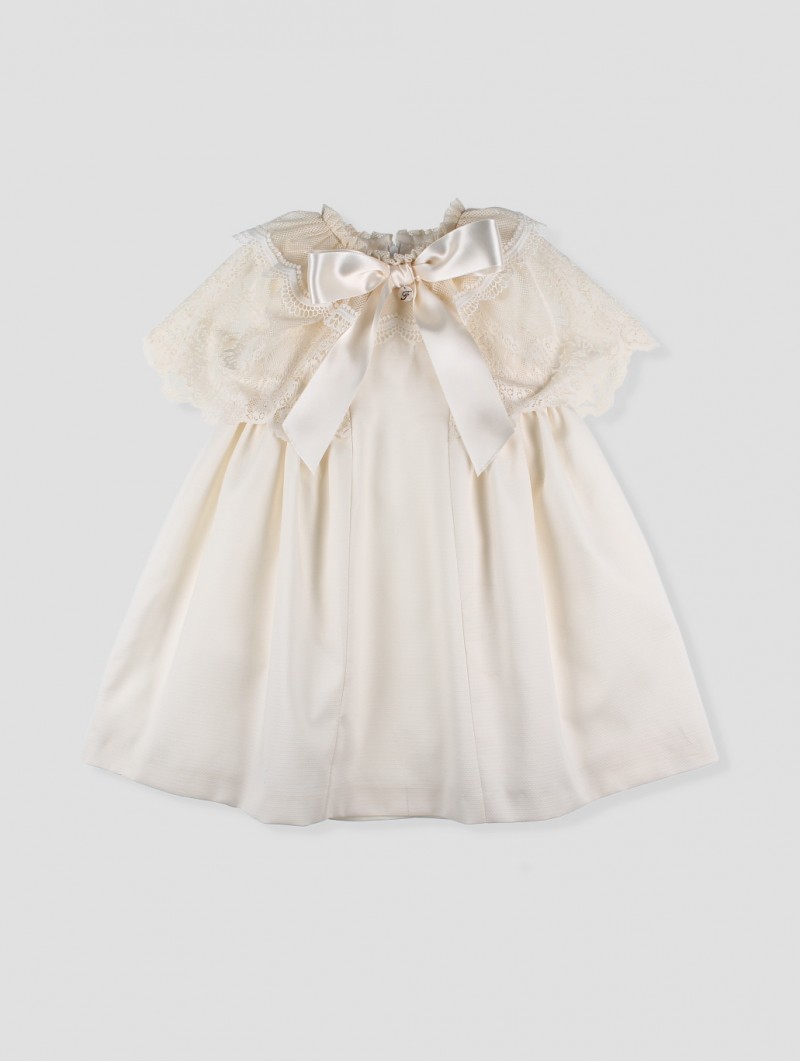 This dress stands out for its exquisite design, featuring an elegant lace overlay that enhances its classic charm. The structured fabric provides a refined silhouette, while the satin bow at the chest adds a distinguished touch. Designed for unforgettable moments like ceremonies and celebrations, it combines delicacy and comfort. Available in soft, romantic shades. Made in Spain