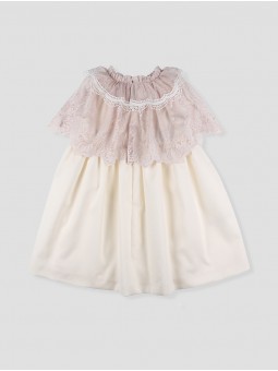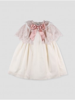 This dress stands out for its exquisite design, featuring an elegant lace overlay that enhances its classic charm. The structured fabric provides a refined silhouette, while the satin bow at the chest adds a distinguished touch. Designed for unforgettable moments like ceremonies and celebrations, it combines delicacy and comfort. Available in soft, romantic shades. Made in Spain