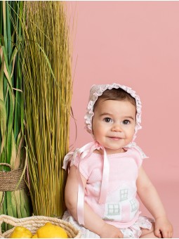 Capota para bebé con volante estampado casitas. Lazos al tono en raso. Abierta en la parte trasera. Ideal para conjuntar con las prendas de la colección Casitas. Fabricado en España.