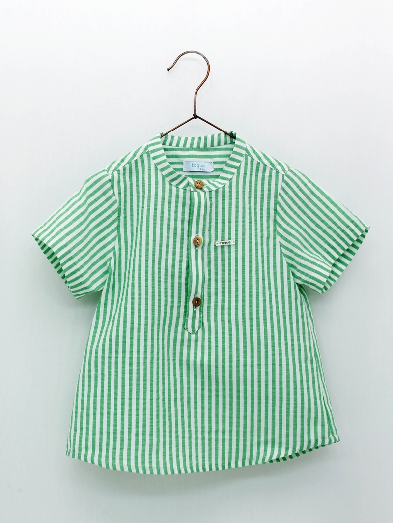 Camisa manga corta en sersucker de rayas con cuello panadero y botones de madera. C.C. Tulipanes. Nuestro pantalón básico de loneta blanco (2215446) es ideal para combinar con esta camisa. ¡Nos encanta el verde para el verano! Fabricado en España.